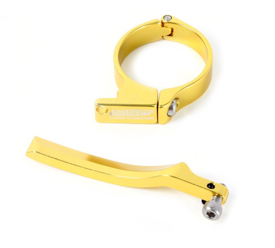 Guiacadenas anti caída con abrazadera de 31.8 mm de diámetro, color oro anodizado y apto para carretera y MTB. Fabricado en aluminio 6061, incluye tornillos y sólo pesa 20,6 gramos