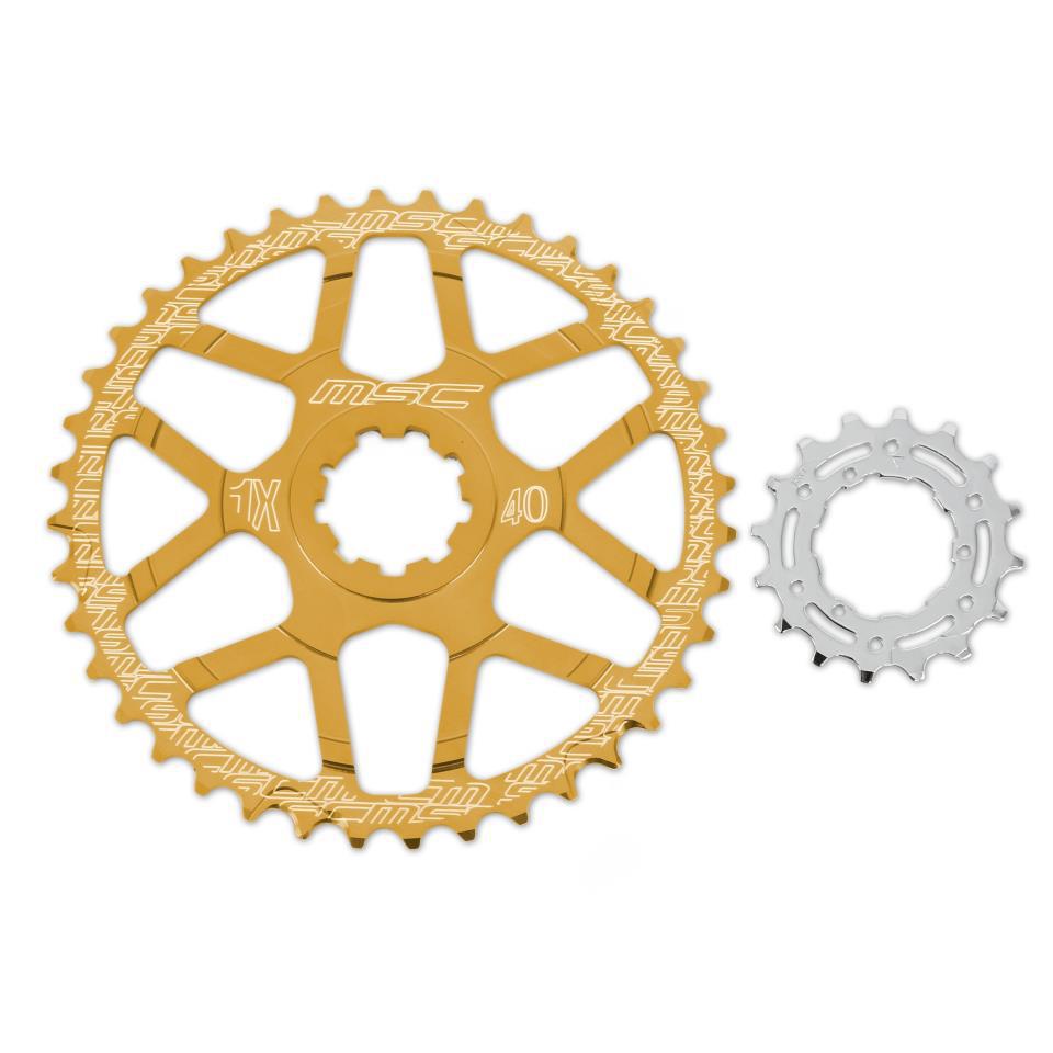 Corona dentada MSC de 40T en color amarillo anodizado, con piñón de 16T incluido. Fabricados en aluminio 7075T6, son compatibles con cassettes Shimano y SRAM