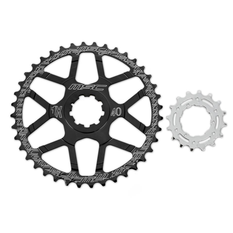 Corona dentada MSC de 40T en color negro anodizado, con piñón de 16T incluido. Fabricados en aluminio 7075T6, son compatibles con cassettes Shimano y SRAM