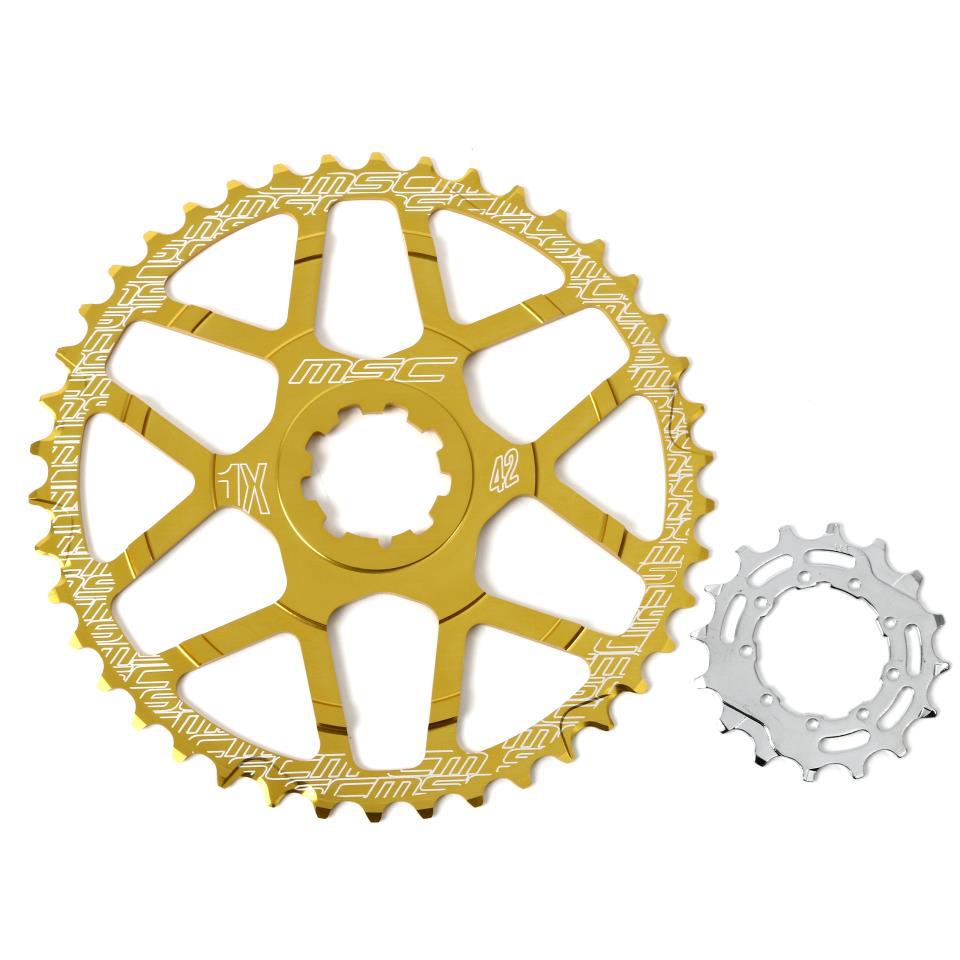 Corona dentada MSC de 42T en color amarillo anodizado, con piñón de 16T incluido. Fabricados en aluminio 7075T6, son compatibles con cassettes Shimano y SRAM