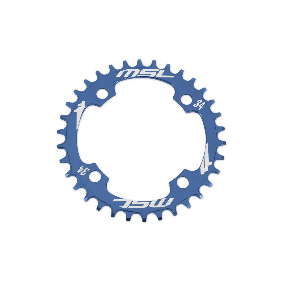 Plato MSC de 4 brazos fabricado en aluminio CNC 7075, color azul. 34T y 104 mm BCD. Compatible con el sistema Narrow y con cadenas de 9, 10 y 11 velocidades.