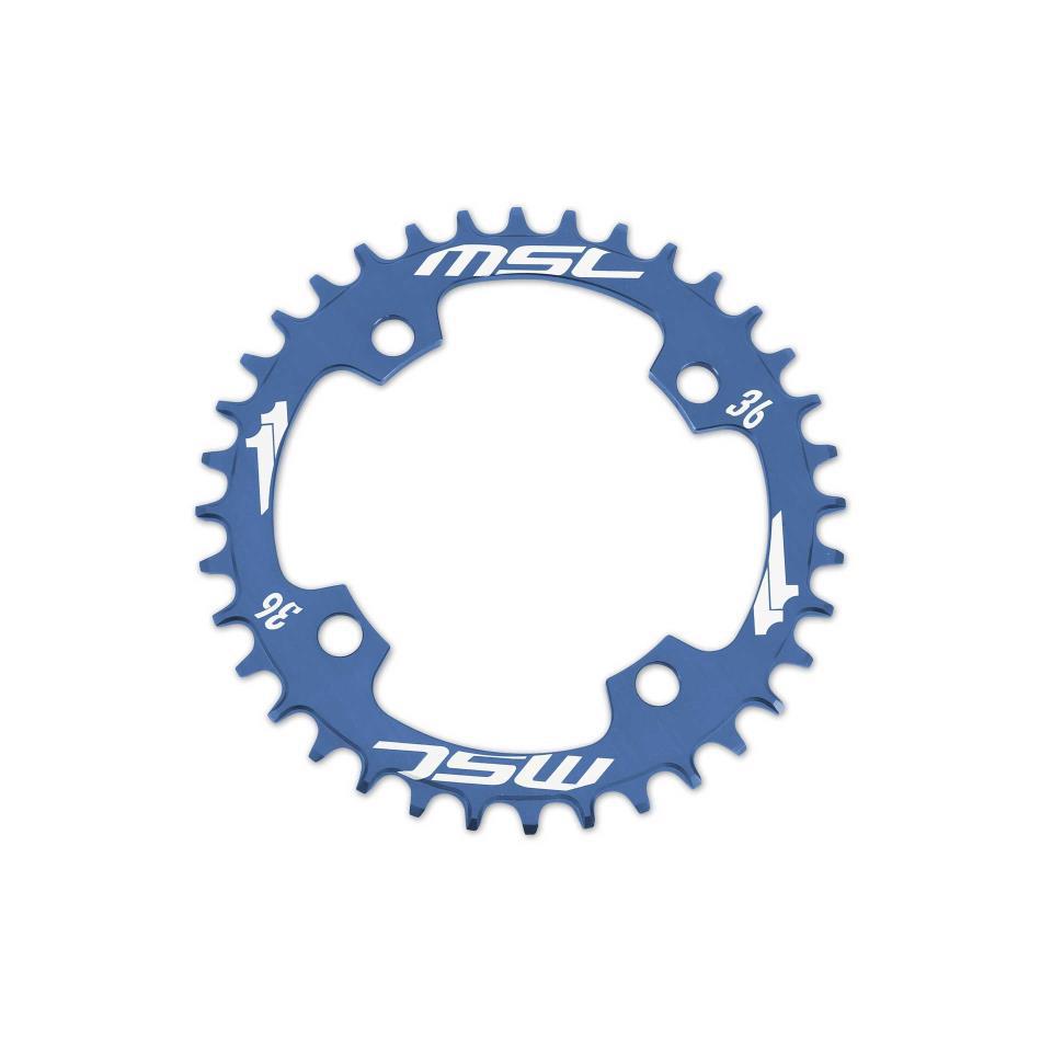 Plato MSC de 4 brazos fabricado en aluminio CNC 7075, color azul. 36T y 104 mm BCD. Compatible con el sistema Narrow y con cadenas de 9, 10 y 11 velocidades