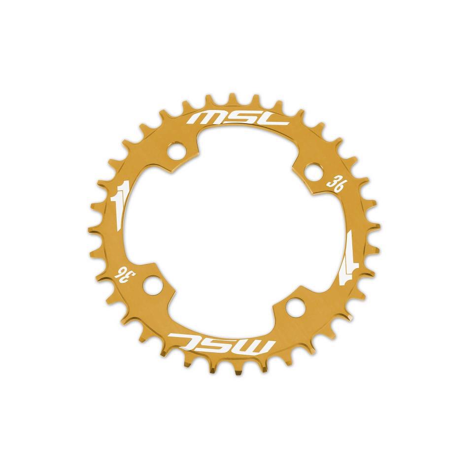 Plato MSC de 4 brazos fabricado en aluminio CNC 7075, color oro. 36T y 104 mm BCD. Compatible con el sistema Narrow y con cadenas de 9, 10 y 11 velocidades