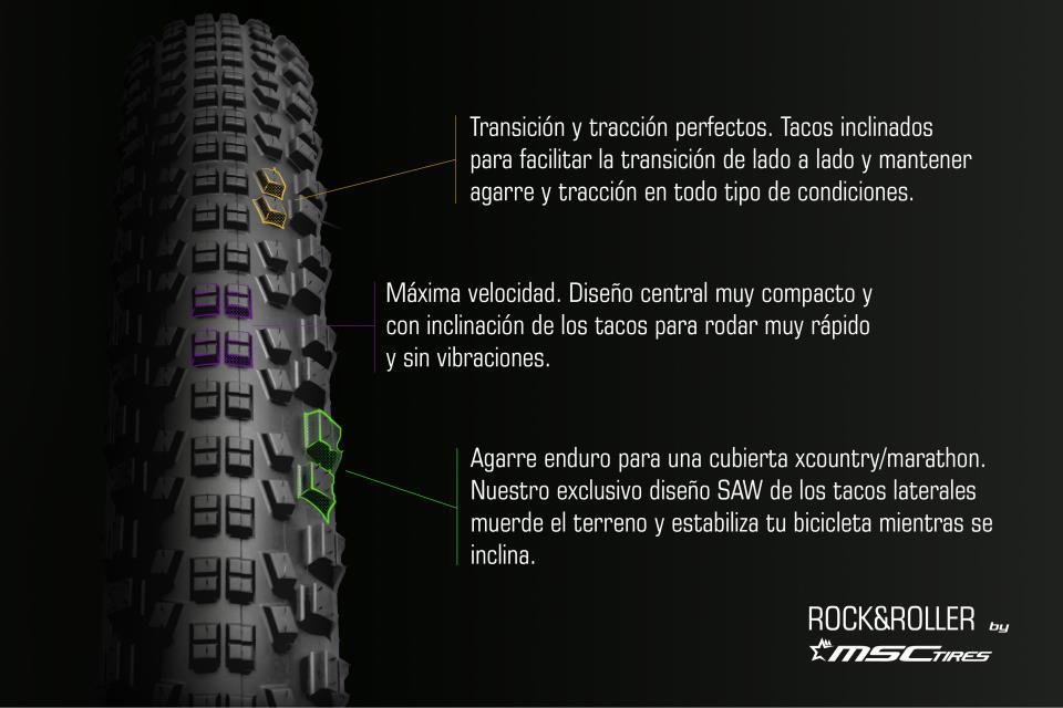 La zona central de tacos paralelos, compactos y con forma de rampa permiten reducir la fricción al máximo para rodar lo más rápido posible. Los tacos intermedios permiten una perfecta transición en curvas y mantienen una buena tracción en todo momento, mientras que los tacos laterales sobredimensionados y dispuestos con nuestro famoso diseño escalonado otorgan al Rock&Roller un agarre en curva nunca visto en una cubierta de xcountry/maratón.
