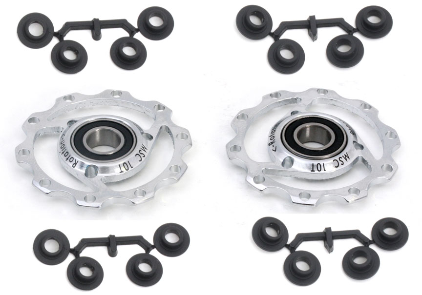 Juego de 2 rulinas/roldanas MSC Ultralight fabricadas en aluminio 7075T6, color cromo anodizado. 10D, con espaciadores incluidos de 0.6, 0.9, 1.1 y 1.6. Pesa 11 gr/par
