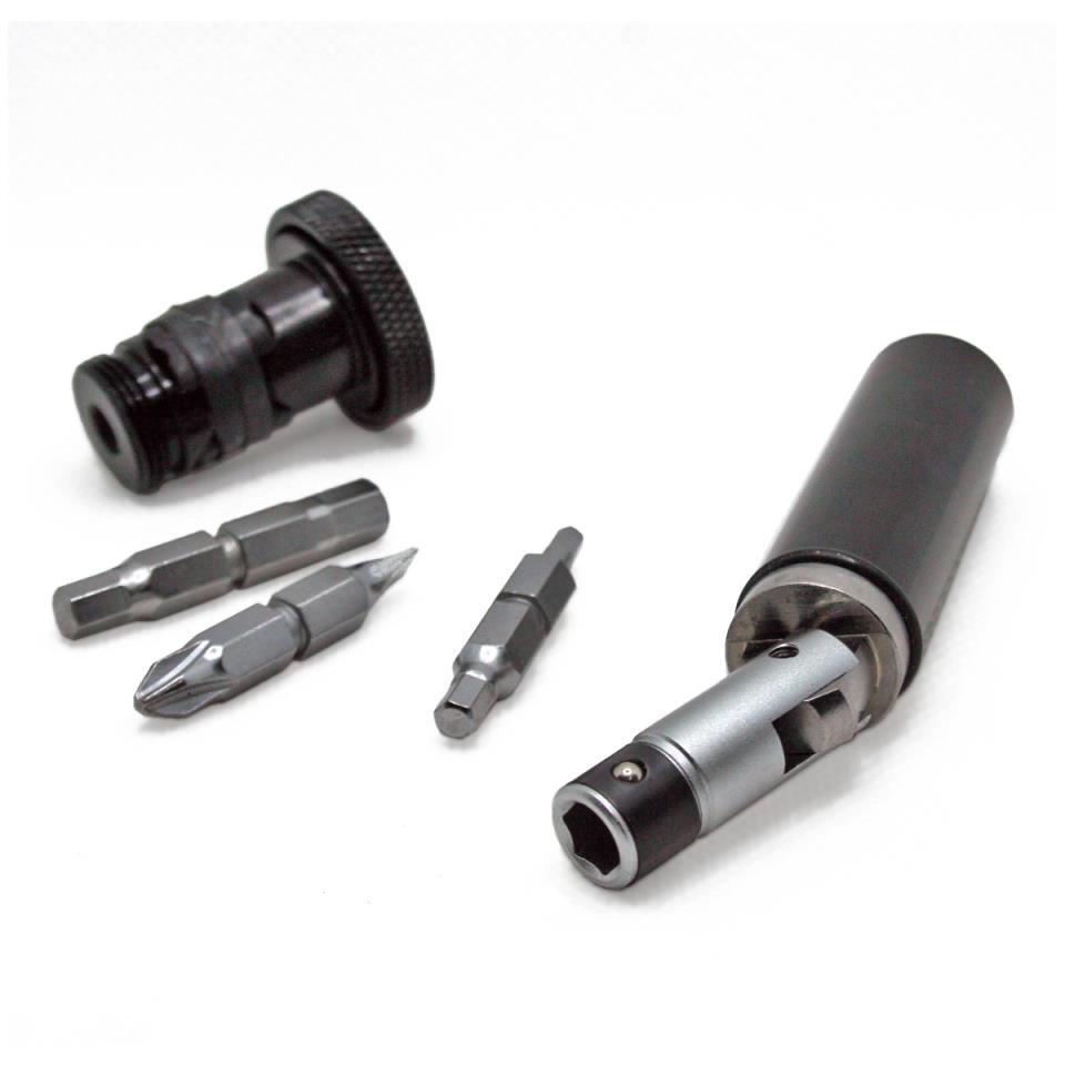 Diseño minimalista con sistema de carraca y diferentes cabezales permiten un tamaño ultracompacto para el abc de las herramientas necesarias durante tus salidas.