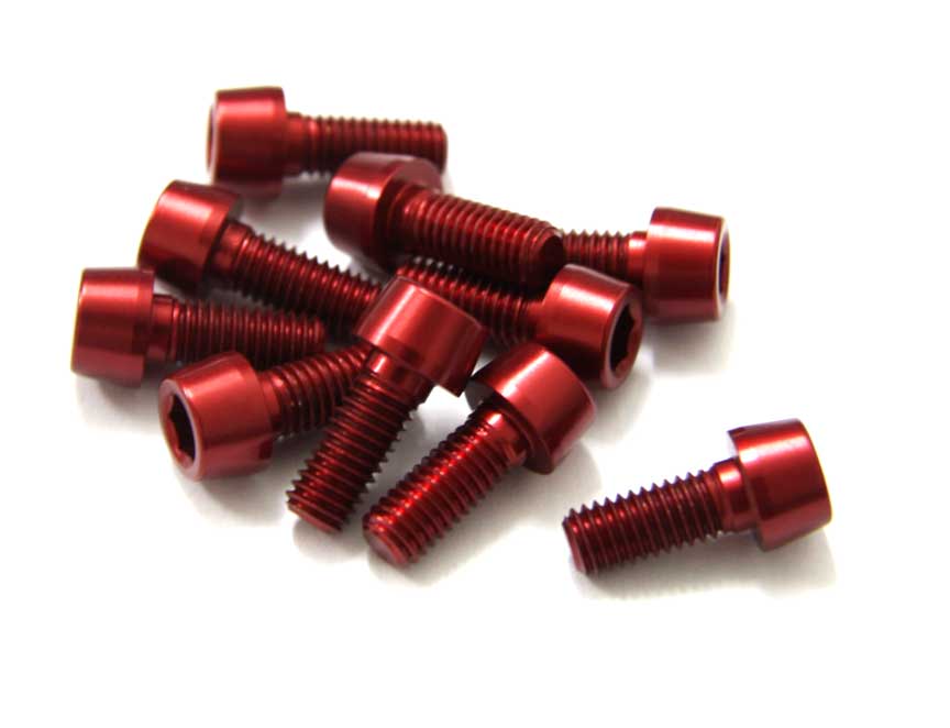 Juego de 10 tornillos fabricados en aluminio 7075T6, M5x12 mm. En color rojo anodizado, tienen un peso de 1 gr/unidad