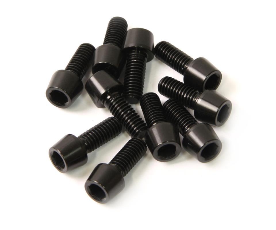Juego de 10 tornillos fabricados en aluminio 7075T6, M6x15 mm. En color negro anodizado, tienen un peso de 1,8 gr/unidad