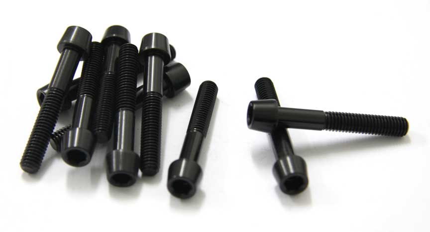 Juego de 10 tornillos fabricados en aluminio 7075T6, M6x40 mm. En color negro anodizado, tienen un peso de 3,7 gr/unidad
